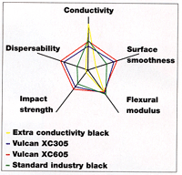 对于ESD应用程序,Cabot必须为一个非常不同的要求设计新材料。欧洲杯足球竞彩电导率,刚度和冲击强度是该扇区的主要性能要求,表面平滑度和可分散性也是重要的考虑因素。通过大多数其他等级的导电黑色,电导率性能趋于降低光滑度,弯曲模量和冲击强度。考虑到这一点,Cabot的产品开发计划的目的是实现所有五个主要绩效标准,没有通常遇到的权衡。 如在为压力管开发的p型的情况下,通过硫磺等级实现了高度的分散性,导致良好的聚合物润湿和全脱离聚集,如果创造所需的细颗粒网络是必不可少的欧洲杯猜球平台在整个基质中形成连续路径。这种卓越的电导率可以允许复合配方使用相对较低的负载来实现应用的最小所需表面电阻率。它还需要化学清洁度,以避免可能导致电子设备失败的离子迁移。2020欧洲杯下注官网图1中的星形图比较了Vulcan XC305,XC605和XC72的相对性能,相对于五个主要性能措施,具有额外导电的黑色。额外导电的黑色具有卓越的导电性,但在所有其他方面都是不合标准的,而Vulcan等级则提供平衡的性能。