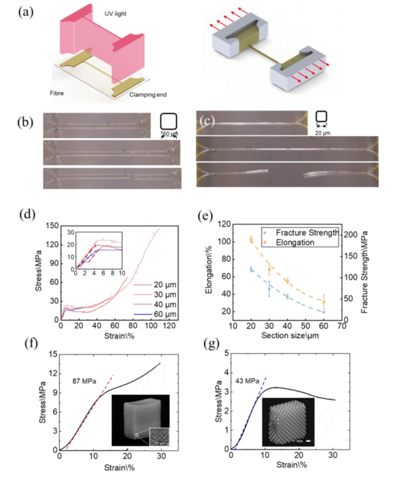 香港城市大学的教授吕杨显示投影micro-stereolithography (PμSL)印花超细纤维可以明显变得更强大和更韧性降低大小从20微米到60微米,表现出明显的尺度依赖的力学行为,断裂应变的大小减少到20微米~ 100%,断裂强度~ 100 MPa。